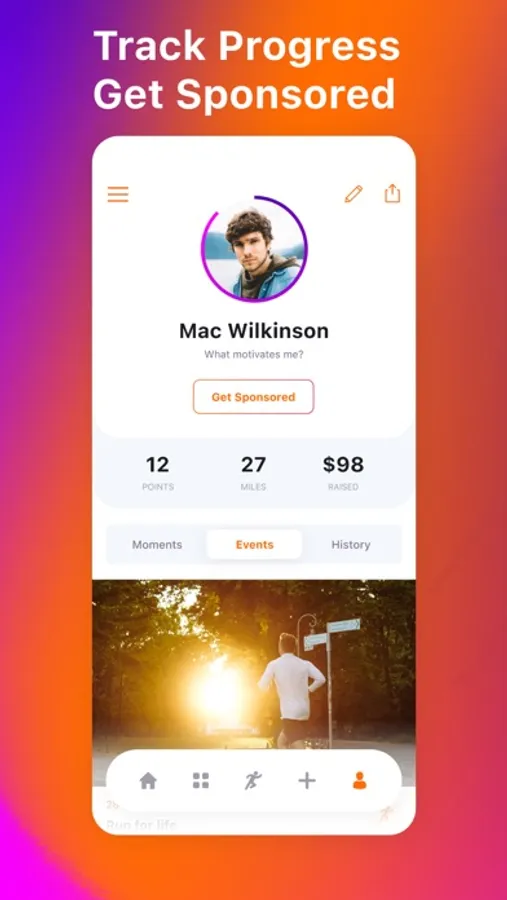 2. Get Sponsored - Sponsors pledge a money per mile, and set how many miles they will sponsor.
