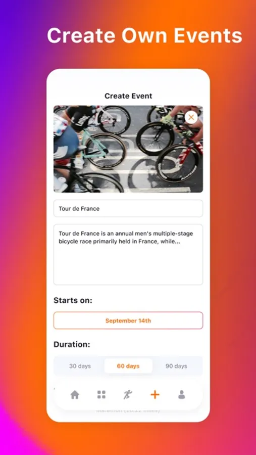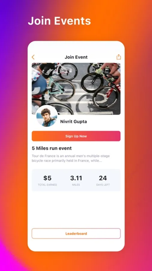 1. Create Your Event.Set the distance, description, and minimum entry fee for your event.