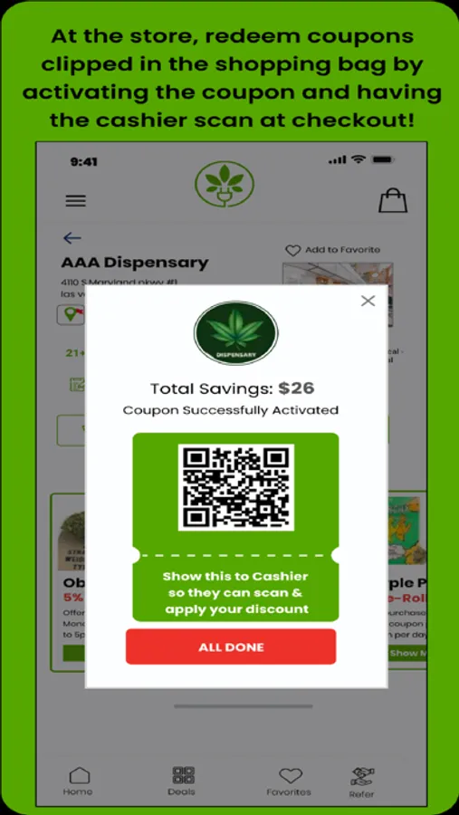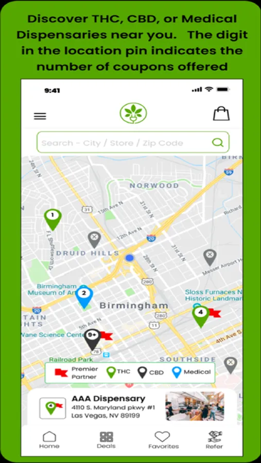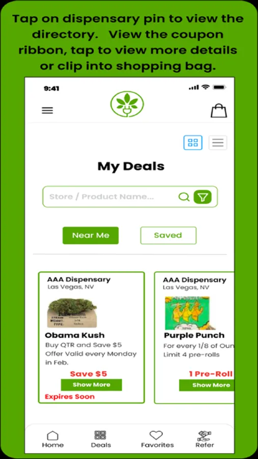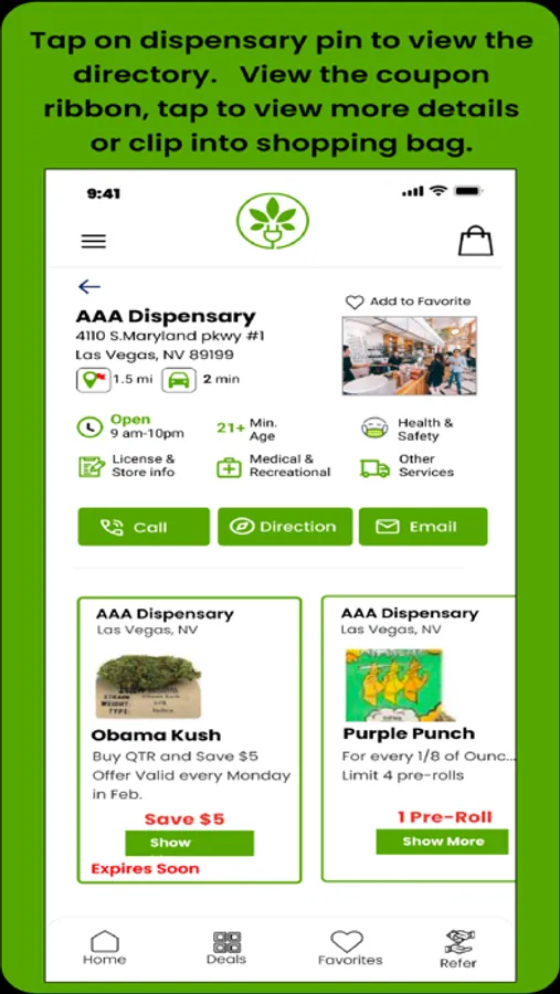 We are currently in Las Vegas, Southern CA, and Arizona – expanding quickly to a city near you.   Download our FREE app and use the map to discover licensed dispensaries offering coupons near you.   View exclusive deals on your favorite products, click, redeem, and save.   Mark your favorites and share deals with your +21 year old friends.   Find information on licensed dispensaries near you, get driving directions, and contact them directly from their directory page.