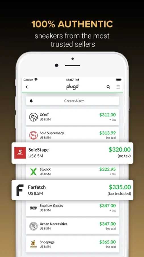 Our growing list of vendors includes StockX, Goat, Urban Necessities, Sole Supremacy, SoleStage, Stadium Goods, Shoepugs, Farfetch, and more.