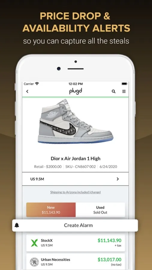 Plugd gives you access to the largest inventory and pricing database of pre-verified authentic new & used sneakers from Nike, Adidas, New Balance, and more. Plugd digs up real-time pricing, inventory, shipping, and tax information for both new & used sneakers from marketplaces and stores like Goat, StockX, Stadium Goods, and even eBay.