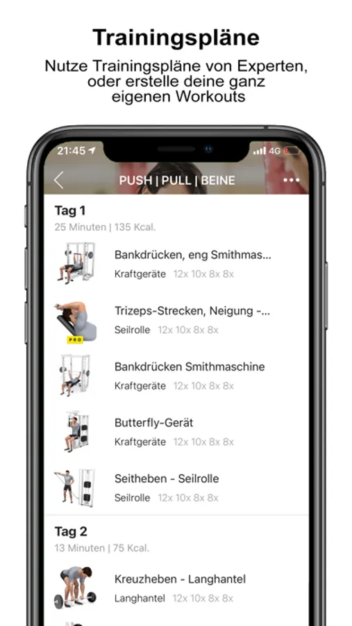 Vorgegebene Workouts und die Option eigene Workouts zu erstellen