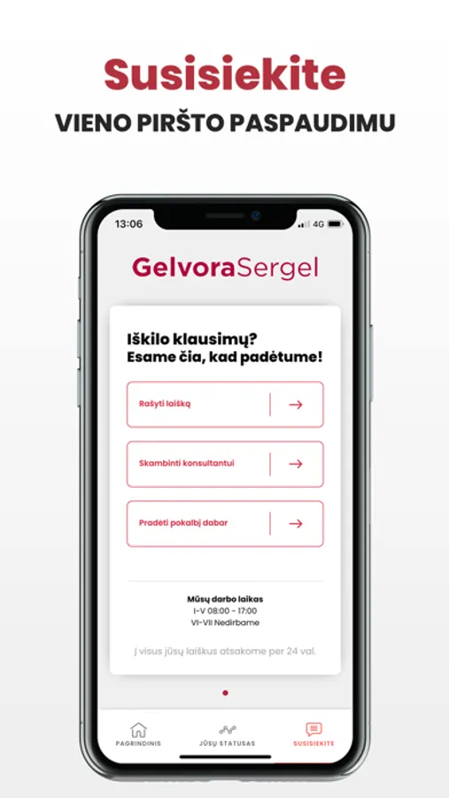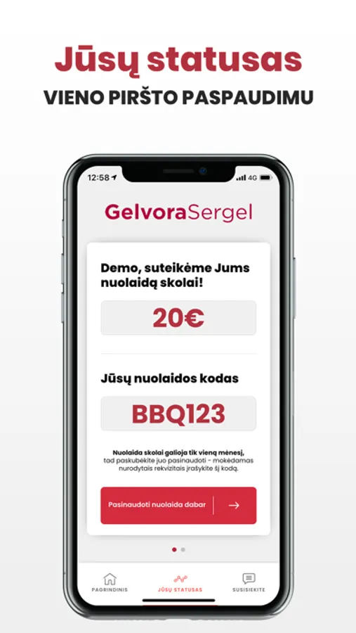 Prisijungęs aplikacijoje matysi ar esi skolingas, savo skolos dydį, statusą ir, norėdami tave nuraminti, aplikacijoje suteiksim nuolaidą tavo skolai. Naudodamas aplikacija vieno mygtuko paspaudimu galėsi susisiekti su mumis ir realiu laiku gauti informaciją apie skolą.