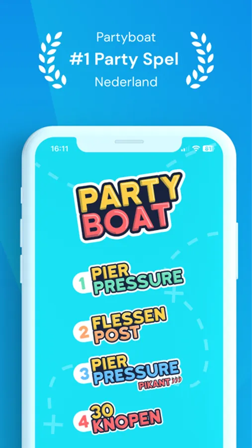 Kortom, ben jij ook zo klaar met de standaard spelletjes zoals Picolo, of doen durf of de waarheid? Dan wensen we je veel Speelplezier met de vier leuke en unieke party spellen (Pier Pressure, Flessenpost, Pier Pressure Pikant en 30Knopen)! Deze unieke spellen zijn geschikt voor familie of vrienden en dit maakt Partyboat het gezelligste party spel van Nederland.