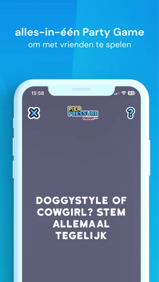 Pier Pressure Pikant is de heetste party game van de app. Waarbij de reguliere Pier Pressure nog relatief rustig verloopt, gaan bij Pier Pressure Pikant alle regels overboord. Niks of niemand is meer veilig en er zullen geheid onvergetelijke dingen gebeuren. Niet bedoeld voor de preutse of bange personen onder ons. Geen onderwerp is niet bespreekbaar en geen persoon kan zich verschuilen. De opdrachten zijn intens en de vragen zijn op het randje! Speel het maar….als je het aandurft!