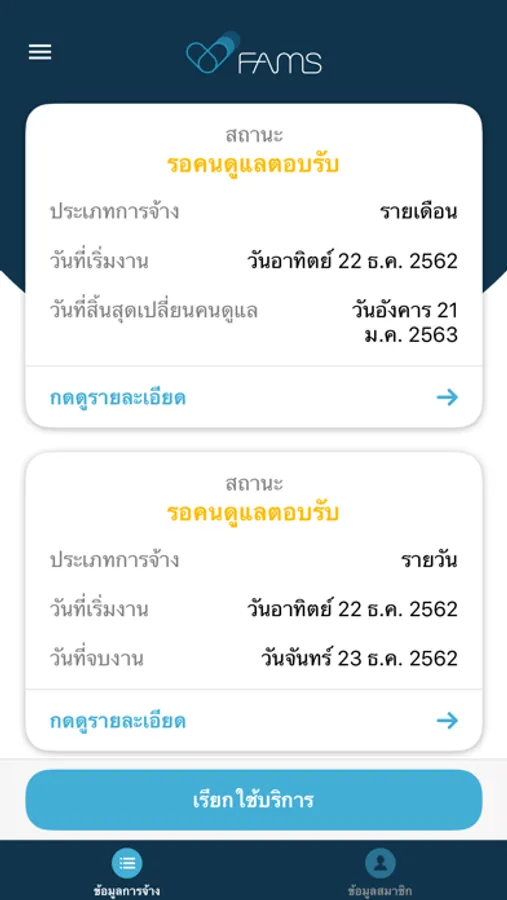 FAMS คือ แอปพลิเคชันที่ใช้ระบบในการจัดหาคนดูแลที่เหมาะสมตามสเปกที่คุณเลือก มีทั้งแบบรายเดือนและรายวัน