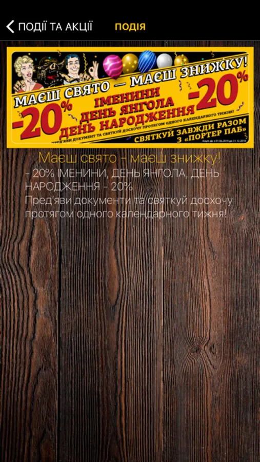 Кожен зареєстрований користувач, автоматично стає членом нашої #PorterPubFamily, і в подарунок отримує електронну дисконтну картку на 10%. За допомогою додатку, Ви зможете забронювати столик, ознайомитись з меню, дізнатися про наше пиво власного виробництва, переглянути Афішу, та обрати найкрутішу акцію, або дізнатися маршрут та контакти найближчого до Вас пабу.