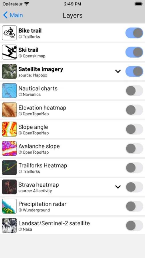 OUTMAP has multiple layers to choose from, including different satellite layers from Mapbox, Google, ESRI, and Bing. You can also view nautical charts, slope angles, avalanche-prone slopes, trailfork heatmap, Strava heatmap, and precipitation radar.