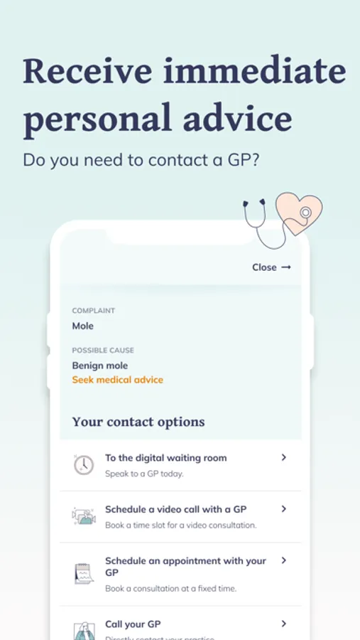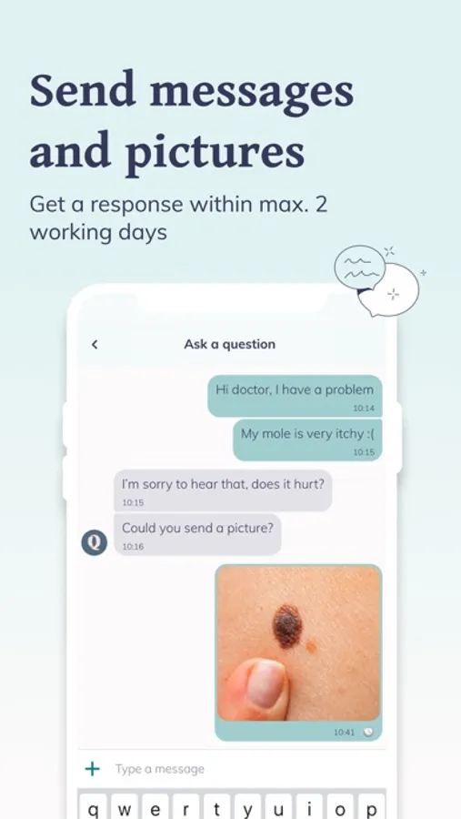 Send messages and/or pictures of your health issue to your GP practice. You will get a response within two working days. Together, you will decide which further steps to take.