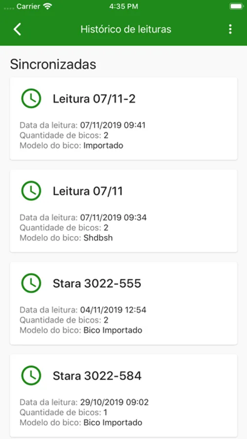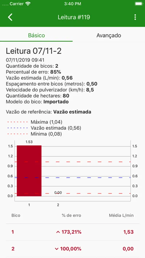 Through the App, it is possible to keep a history of readings, generate reports (with graphs, comparisons between nozzles, etc.) and also export data to WhatsApp, Messenger or emails.
