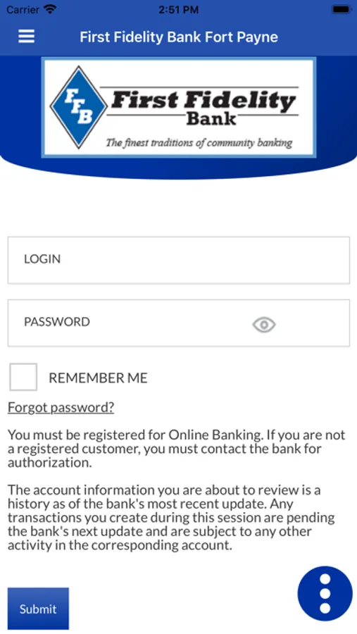 This application allows mobile banking capability for accounts at First Fidelity Bank in Fort Payne, Alabama.