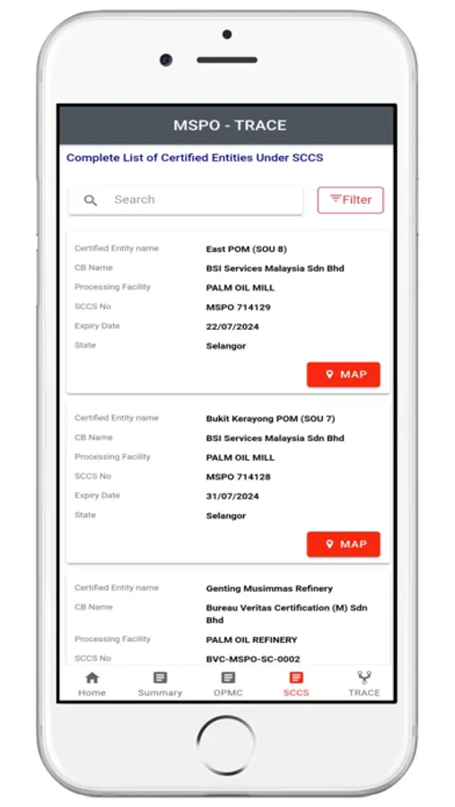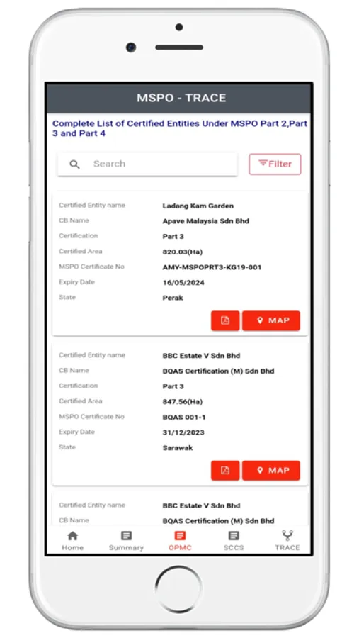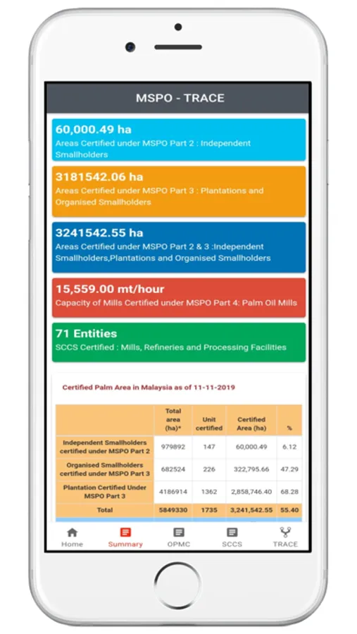 MSPO-TRACE provides the complete statistics of all certified plantations namely the Independent Smallholders, Organised Smallholders and Estates and processing facilities namely the Palm Oil Mills, Palm Oil Refineries, Palm Kernel Crushers, Oleo chemical Plants, Biodiesel Plants and other related industries under Malaysian Sustainable Palm Oil (MSPO) and Supply Chain Certification Scheme (SCCS) standards governed by the Malaysian Palm Oil Certification Council (MPOCC).