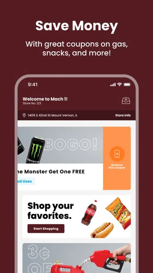 Save money at Mach 1 Stores with great coupons on gas, snacks, and more! Simply tap the orange redeem button and show your phone at purchase to redeem your coupons.