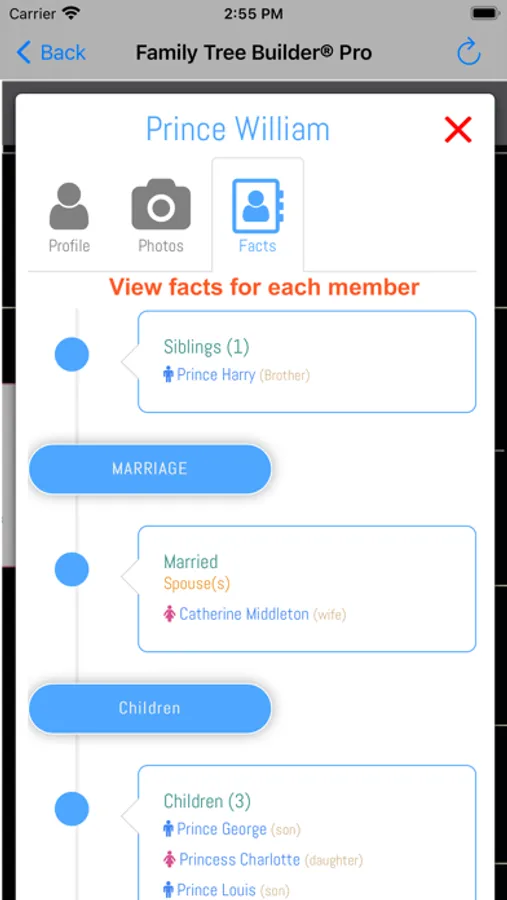 - Get a fact summary for each member detailing the important date milestones including birth, marriage, siblings, grand children and great great grand children.