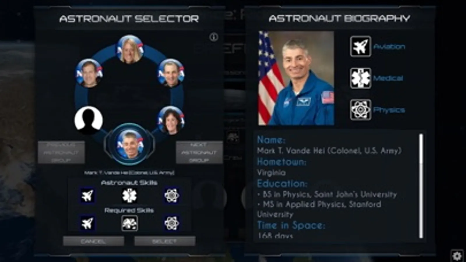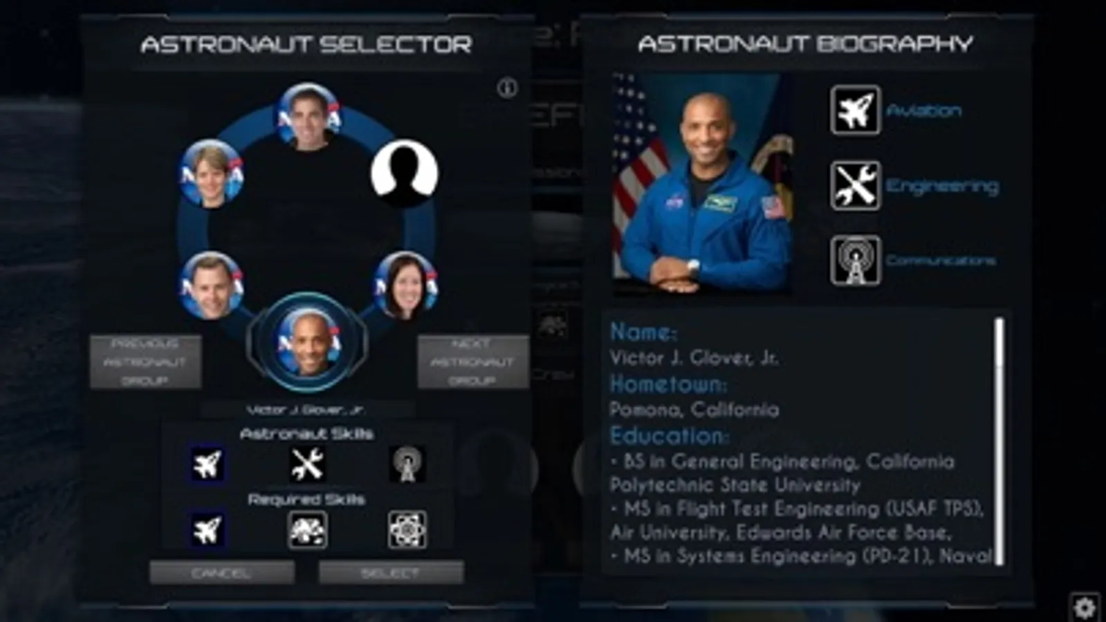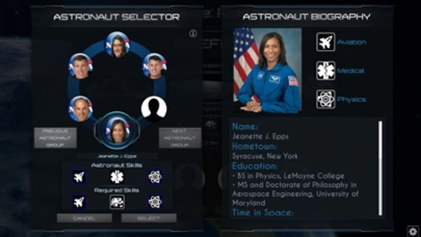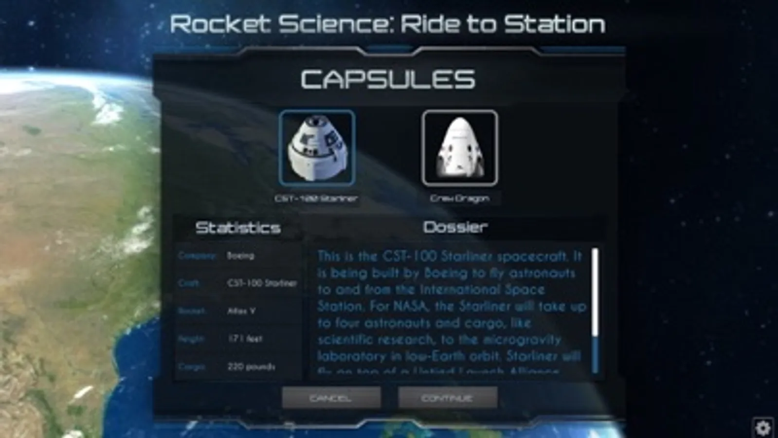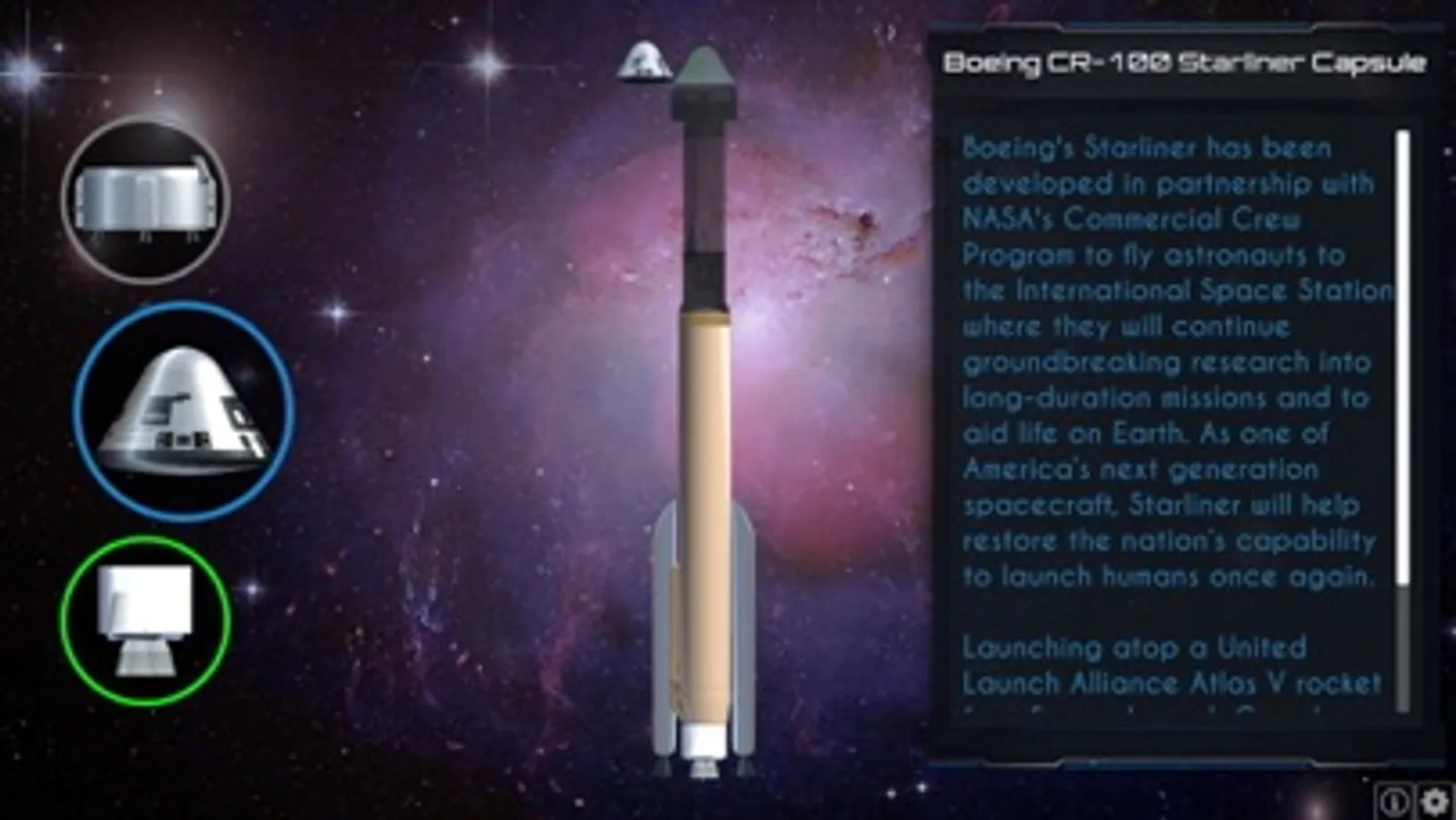 The purpose of this application is to allow user to navigate through several screens with the main objective being to select missions carried out on the International Space Station, select the crew of astronauts, build a rocket, lauch a rocket, jettison components as part of launch stage completion(s), the dock with the International Space Station, all while learning about the components and people required to complete missions to the International Space Station.