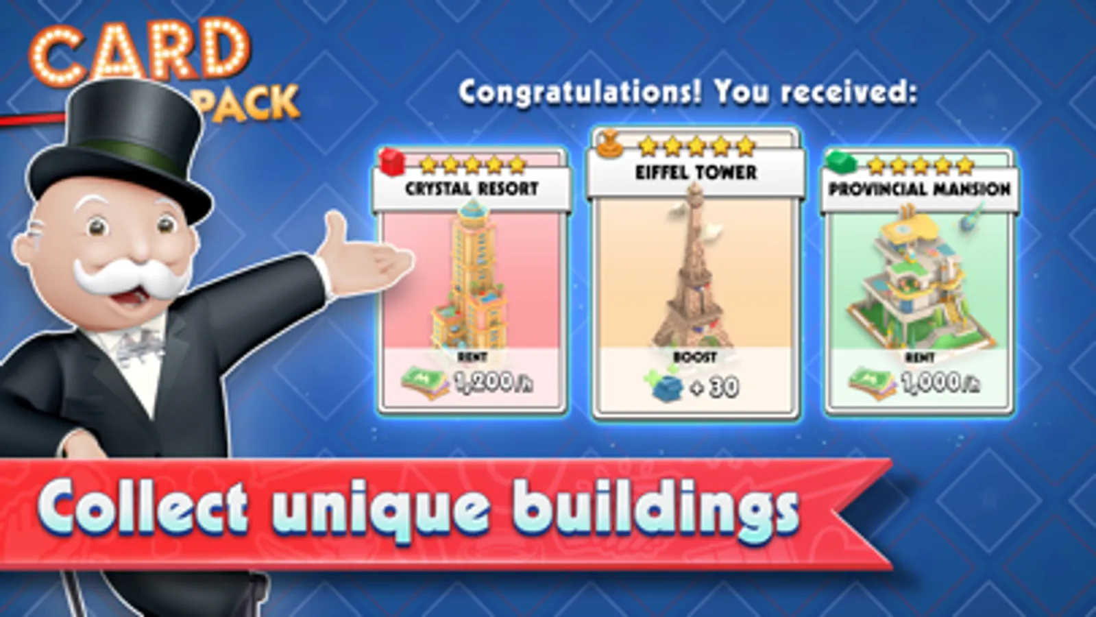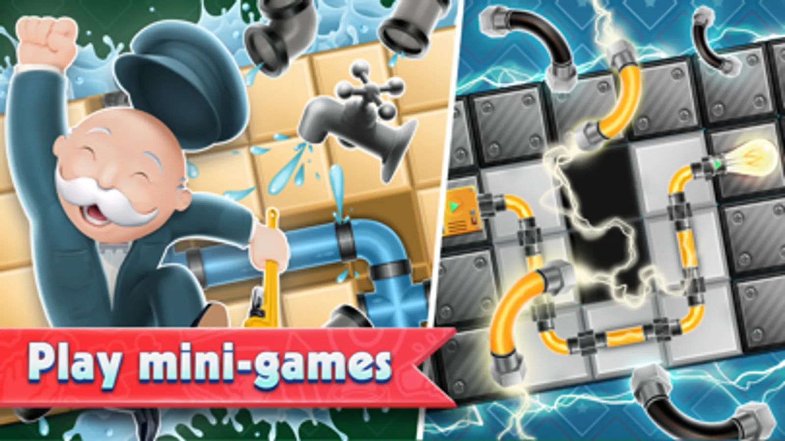This is a MONOPOLY game, and true to its name it gives you the opportunity to buy properties and populate them with a wide variety of buildings: houses, hotels, even businesses! Follow Mr. MONOPOLY’s advice, make wise investments, build the city, and generate ever more rent in the process.