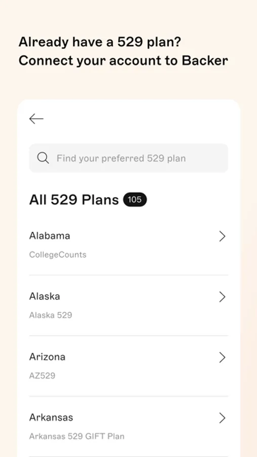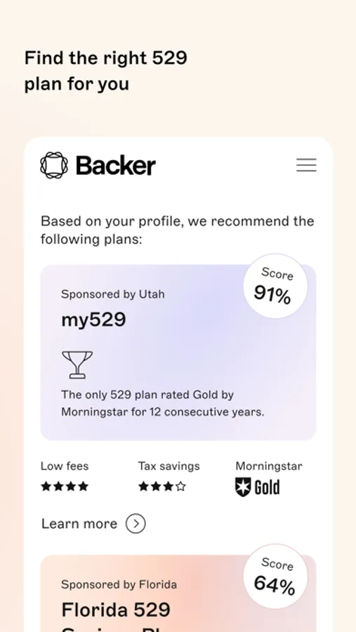 Disclosures: This app is operated by Principly, Inc., an SEC-registered investment adviser using the trade name Backer. Investing involves risks, and any account you open or send money to may lose value. Investing in 529 plans in particular involves certain tax considerations and related risks. For disclosures, see backer.com/legal. "Backer" is a registered trademark of Principly, Inc. Copyright © 2023.