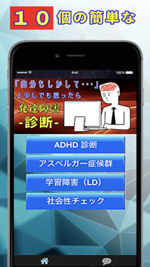 ADHD、アスペルガー症候群、学習障害(LD)、社会性、など様々な項目でセルフチェックが出来ます。