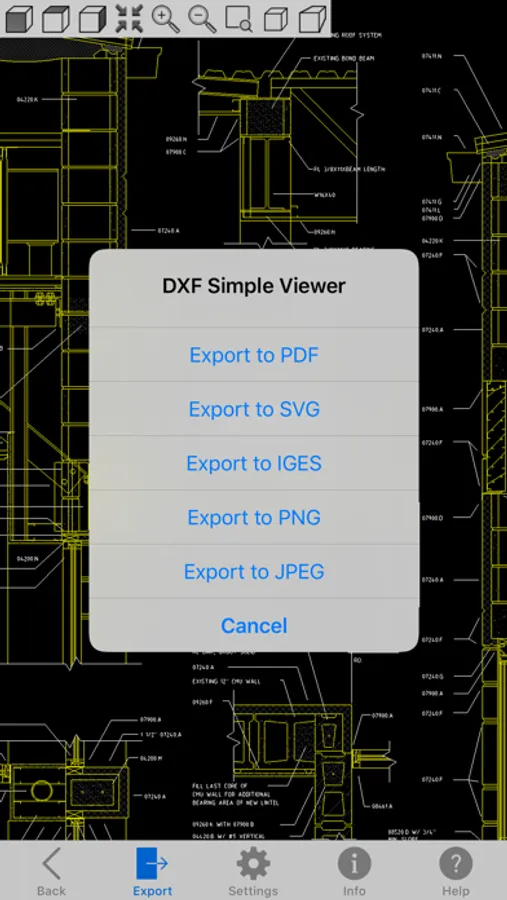 - Export to PDF, SVG, IGES, PNG, JPEG, includes controls for adjusting size.