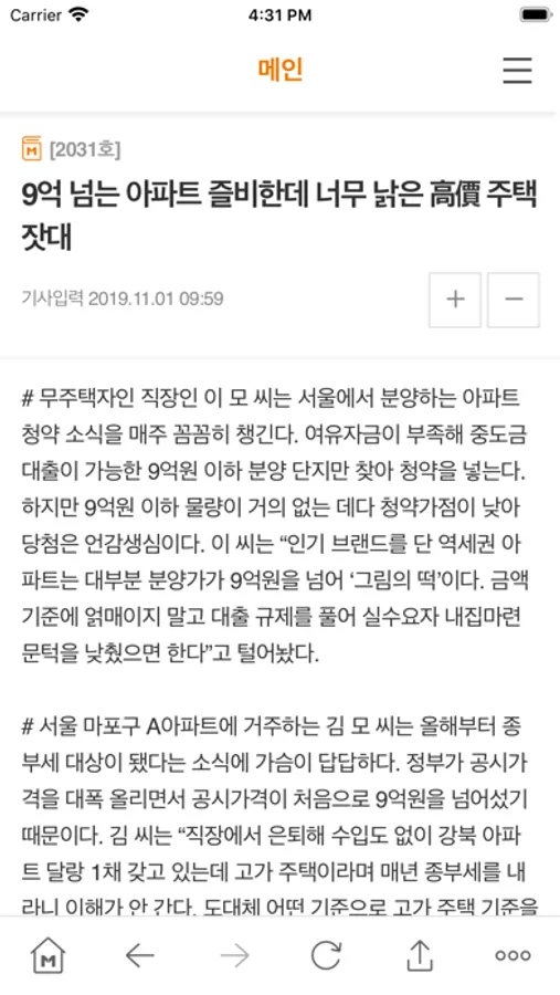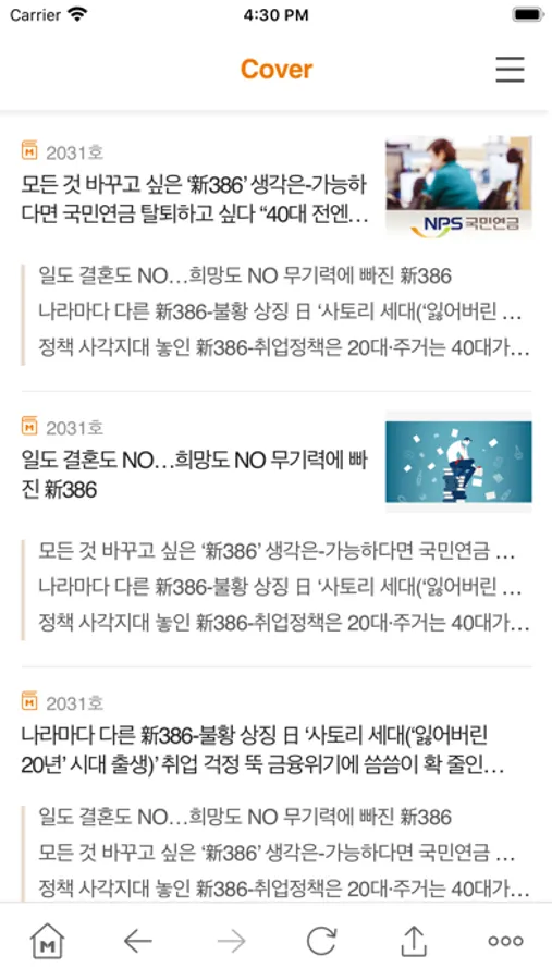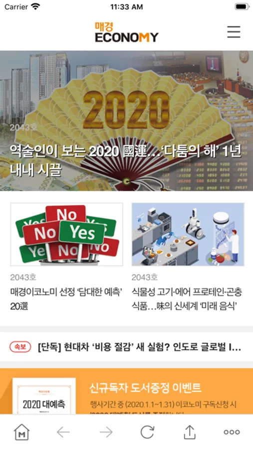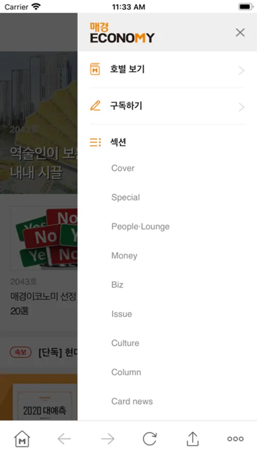 매경이코노미 모바일은 커버, 스페셜, 피플 라운지, 머니, 비즈니스, 이슈, 문화, 칼럼, 카드뉴스 총 9가지 카테고리로 제공이 됩니다.