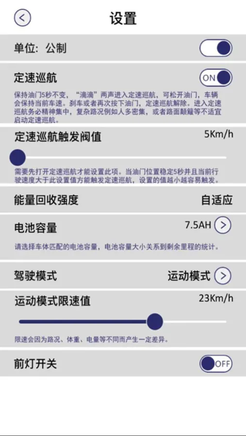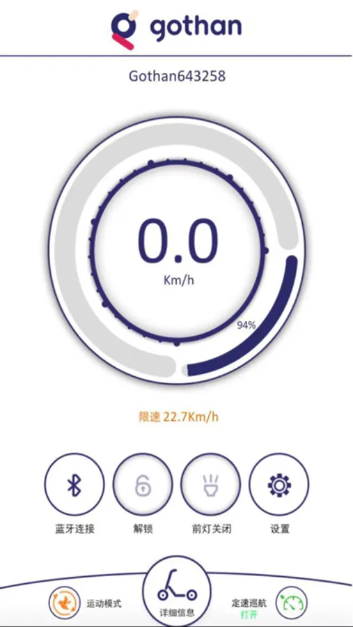 This is a scooter app. The APP communicates with the scooter via Bluetooth. Through the APP, you can view detailed information about the car body, set the car body parameters, and support firmware upgrades.