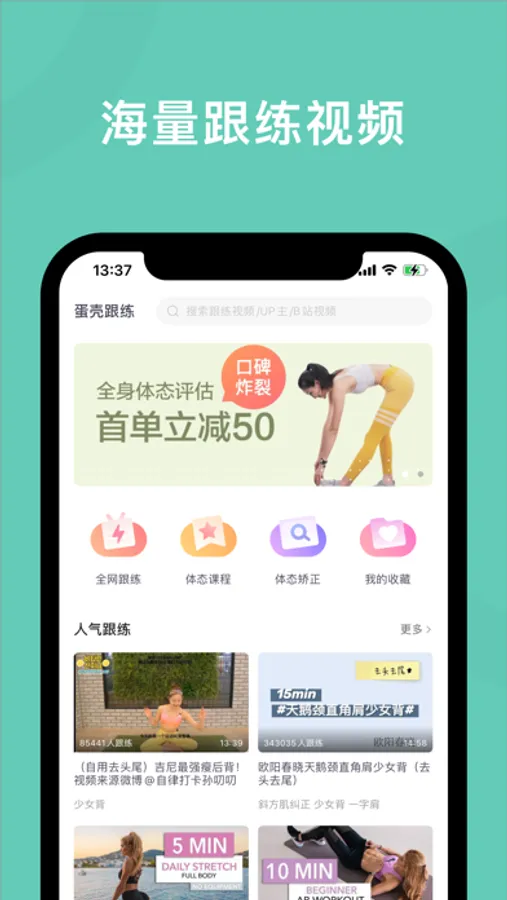针对女性体态专项问题提供矫正塑身体跟练计划,例如各种腿型问题、马甲线、一字肩、天鹅臂、瘦腿、蜜桃臀、收副乳、生理期运动、产后修复,在蛋壳跟练APP,推出最简单有效的塑身跟练计划,让你在短短几周内足不出户,就能在家完成塑身目标,变美丽更健康。