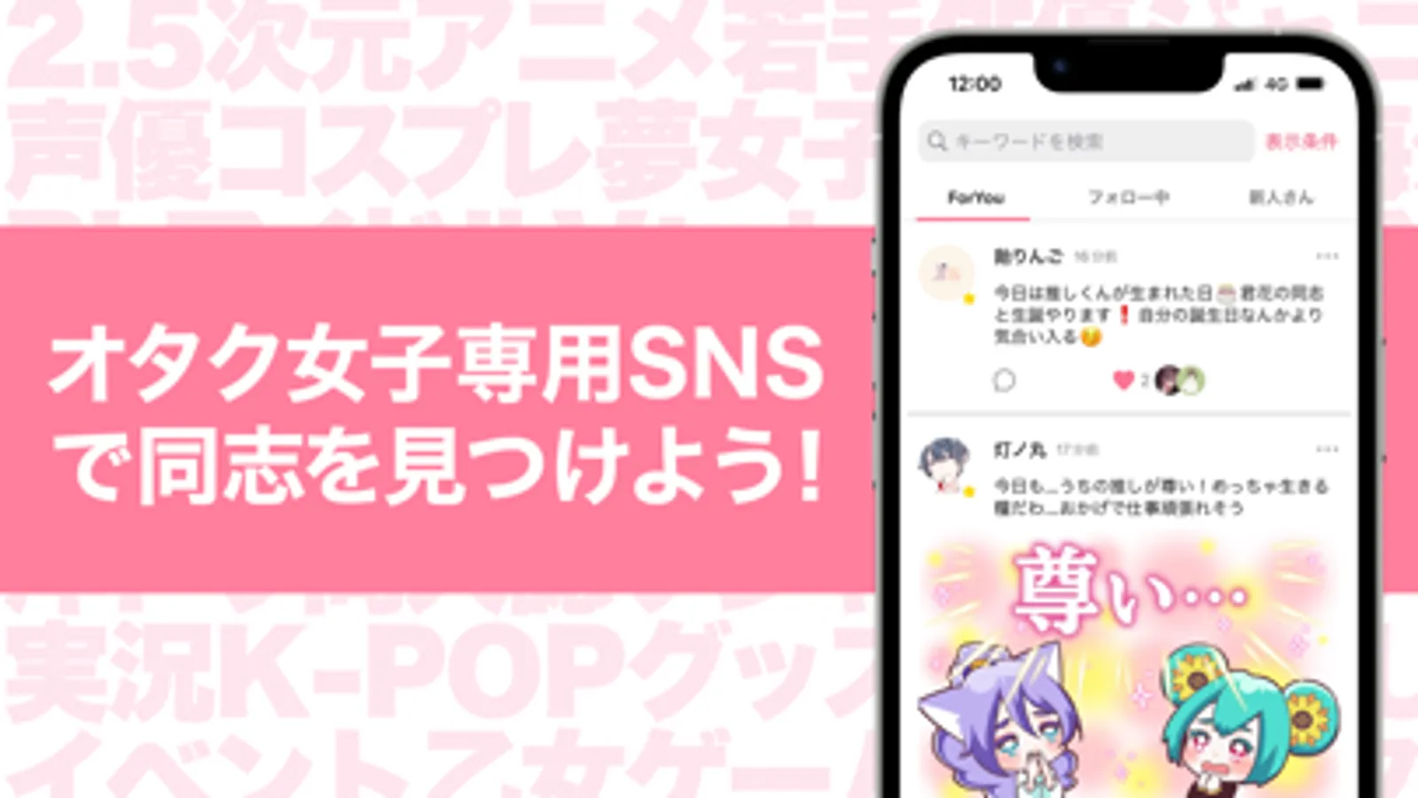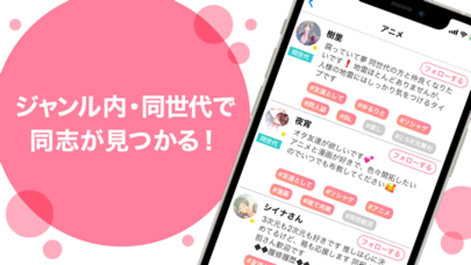 同タグや、同年代のユーザーさんが優先表示されるよ。同年代の友達は、オタ活も生活も似てるから、すぐ仲良くなれちゃうね