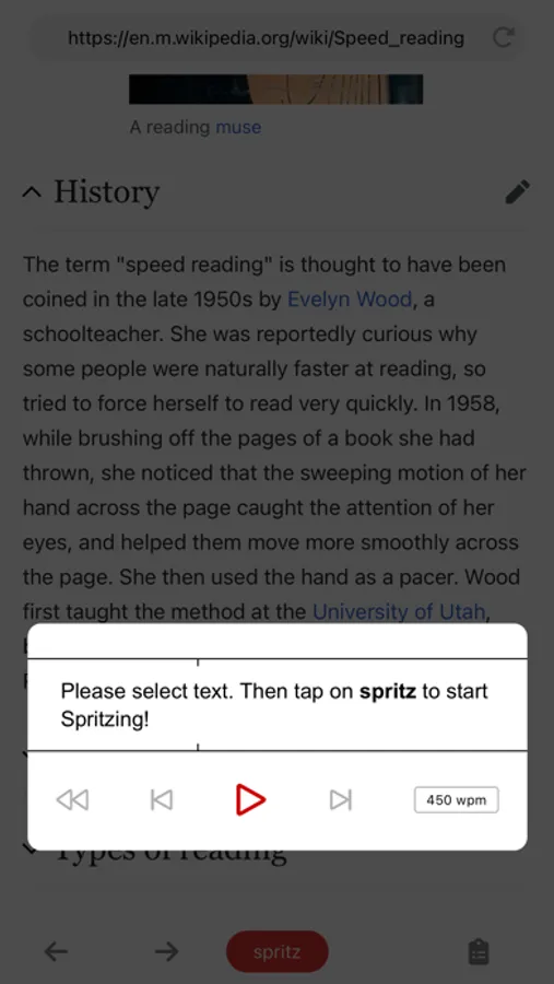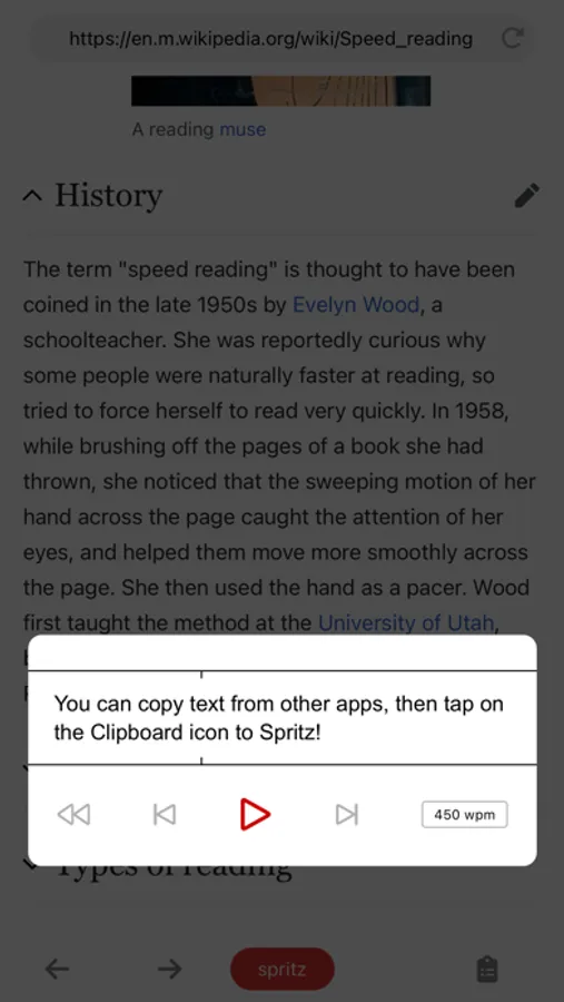 Welcome to the future of reading! Spritz scans the written content of any website (including your favorite news sites) and visually reads it back to you at up to 1100 words per minute. The patented rapid fire, single word display feature is fully adjustable so you can begin training your brain to read up to 2x faster.