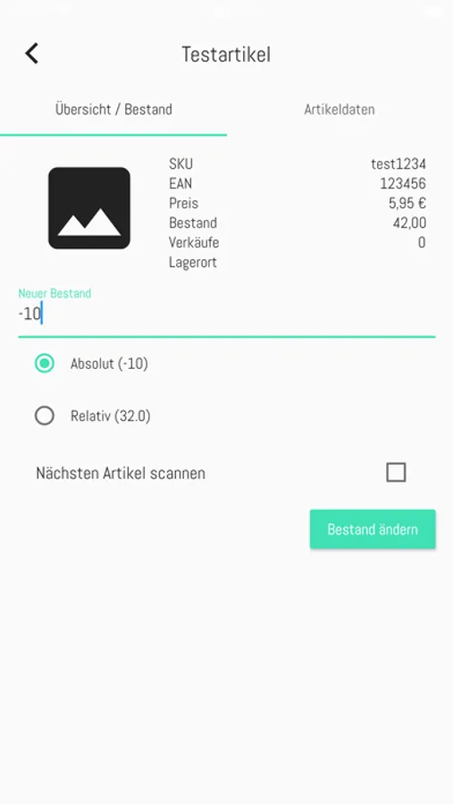 Diese App ermöglicht es dir, durch das scannen des Barcodes deiner Artikel oder durch das eingeben der Artikelnummer / EAN den Artikel aufzurufen und dann den Bestand absolut oder relativ zum aktuellen Bestand zu ändern.