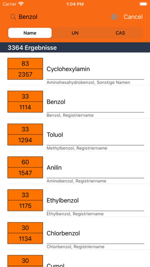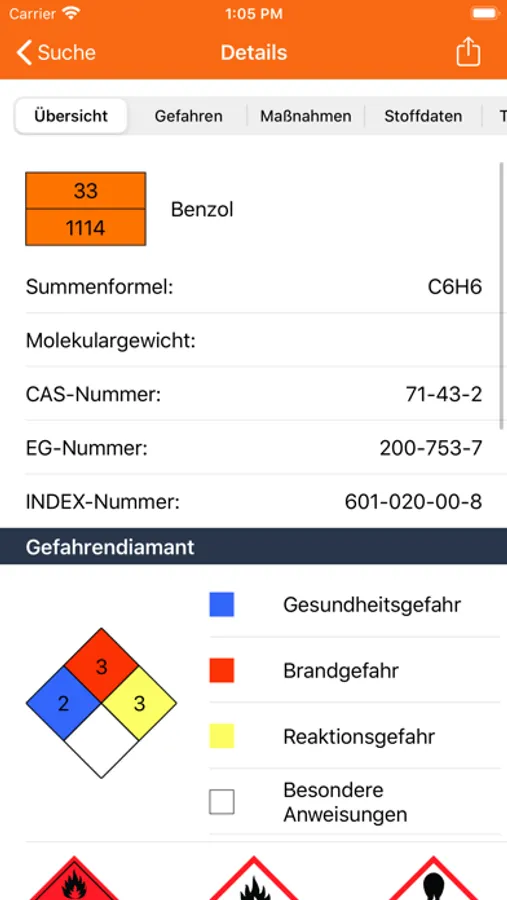 Über die Textsuche können chemische Eigenschaften zu einzelnen Stoffen recherchiert werden. Zur Eingabe und Suche dienen Stoffnamen, CAS-Nummern oder UN-Nummern. Je nach eingestelltem Profil werden die gefundenen Informationen aufbereitet in unterschiedlichen Tabs angezeigt.
