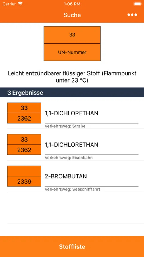 Die GSAapp ist unterteilt in eine Stoff- und Transportsuche. Mit der Transportsuche kann mittels Eingabe von Suchparametern in eine visualisierte Warntafel nach rechtlichen Regelungen und Gefahren von Transportgütern im Allgemeinen gesucht werden.