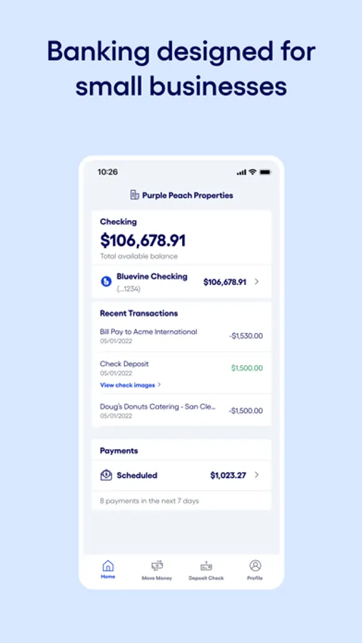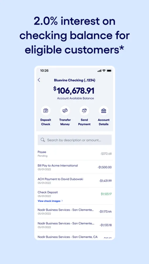 Bluevine Business Checking is a premier checking account thoughtfully designed for a simple, all-in-one digital banking experience. The Bluevine Business Checking app lets you manage cash flow, pay bills, track transactions, and deposit checks right from your phone.