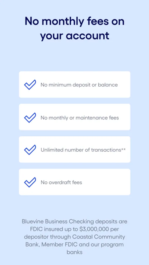 Bank with confidence and peace of mind. Your Bluevine account is FDIC insured up to $3,000,000 per depositor through Coastal Community Bank, Member FDIC and our program banks. We protect your Bluevine account with industry-leading security protocols. For example, you can instantly lock your debit card if you lose or misplace it.