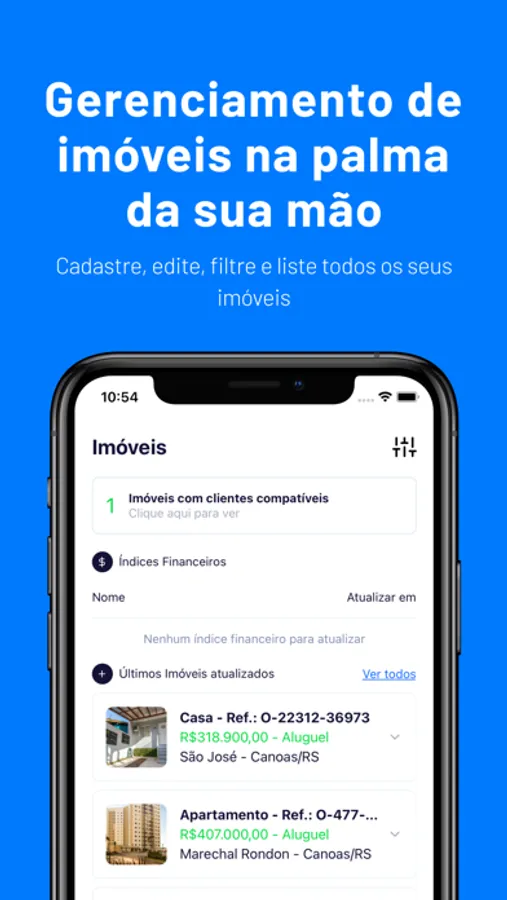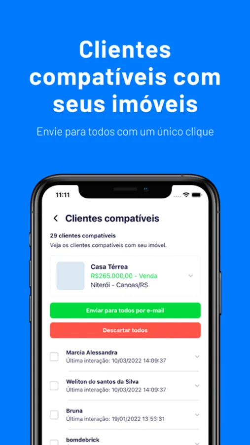 - Imóveis compatíveis: uma listagem completa de imóveis compatíveis com os perfis dos seus clientes foi adicionada. Envie por WhatsApp, E-mail ou descarte os imóveis compatíveis com um único clique, de forma fácil e rápida.