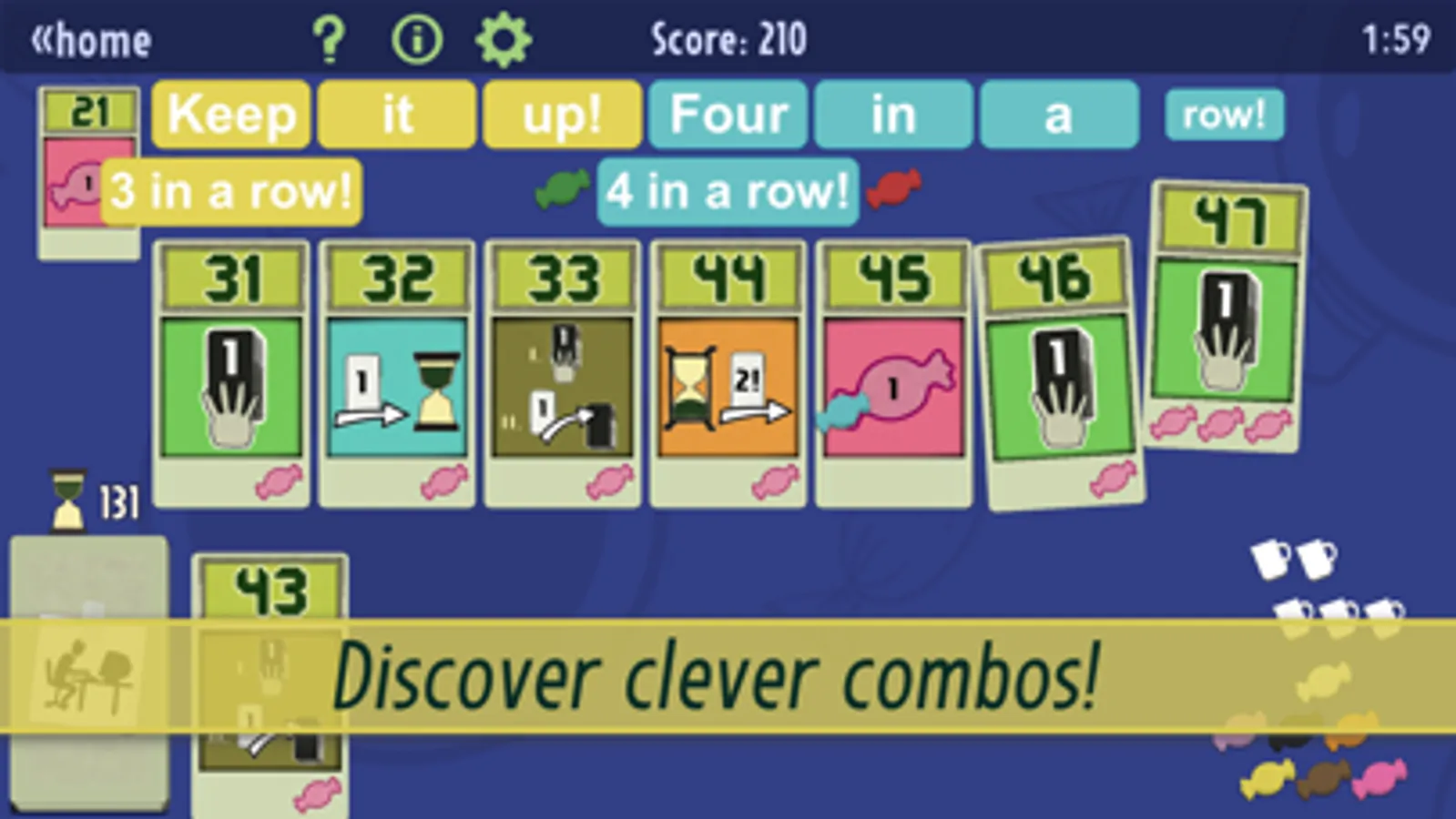 Deal 3 cards at a time, like regular solitaire but you can use candy to activate cards to draw more and rearrange them. Gain more candy when you have a run of cards (e.g. 7-8-9). If you love Spider or FreeCell solitaire you'll love Finished!
