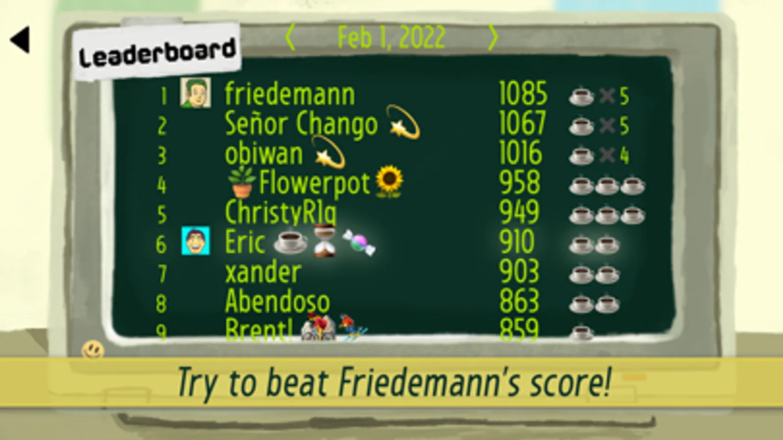 Finished! features fantastic fun, smooth animation, subtle sound effects and dynamic music that changes with your gameplay. Try the Daily Challenge which Friedemann plays *every* day. See if you can literally beat him at his own game. :)