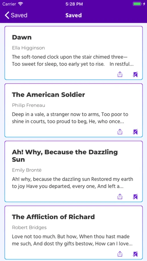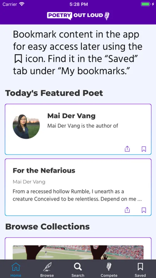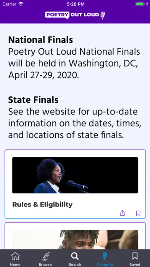 The app contains 1,000+ poems available to use in the competition. Use the bookmark feature to save them for quick access later when practicing your recitation. The Compete tab also contains all of the relevant information about participating in the contest.