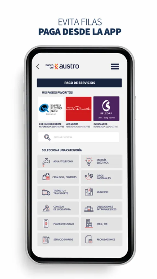 - Paga tus tarjetas de crédito del Banco del Austro y de otras entidades financieras.