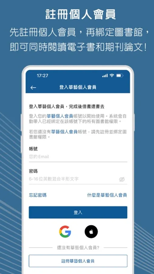 - 帳號整合:一個Airiti個人帳號,通行iRead eBooks華藝電子書與Airiti Library華藝線上圖書館。
