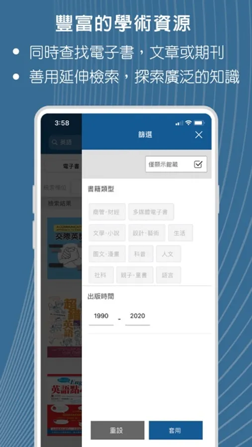 - 跨文獻類別學術服務:整合電子書與期刊論文資源,為學術研究提供完整支援。