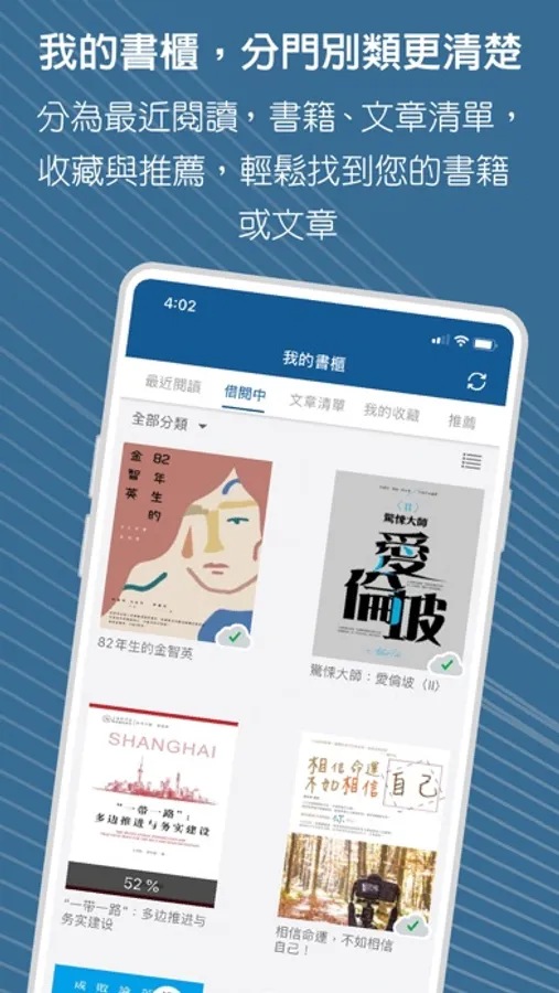 - 彈性的個人設定:可新增圖書館、選擇下載檔案類型、設定圖書館書籍分類排序,滿足您的閱讀偏好。