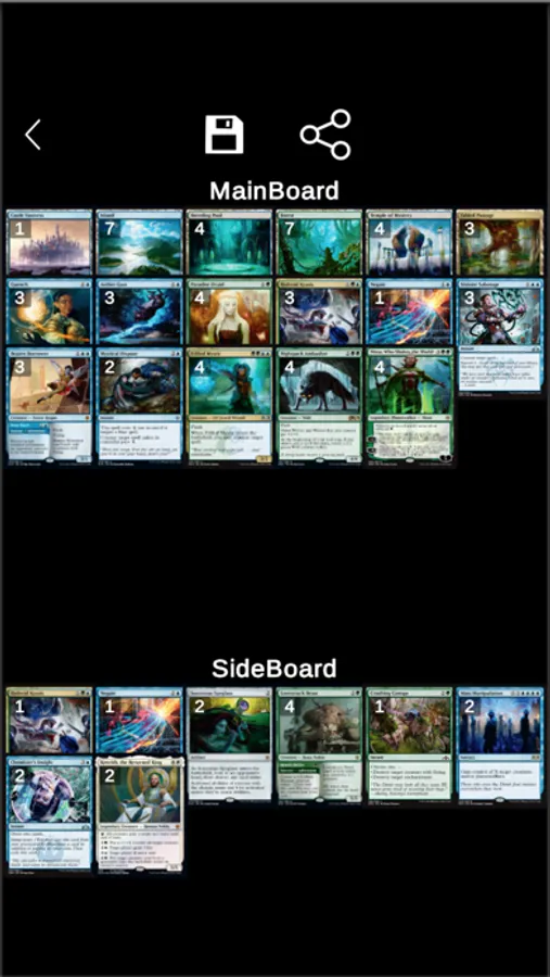 Card images, deck lists including those for MTG Arena and deck registration sheets can be shared with friends using the share function to attach and send to SNS, e-mail, etc.