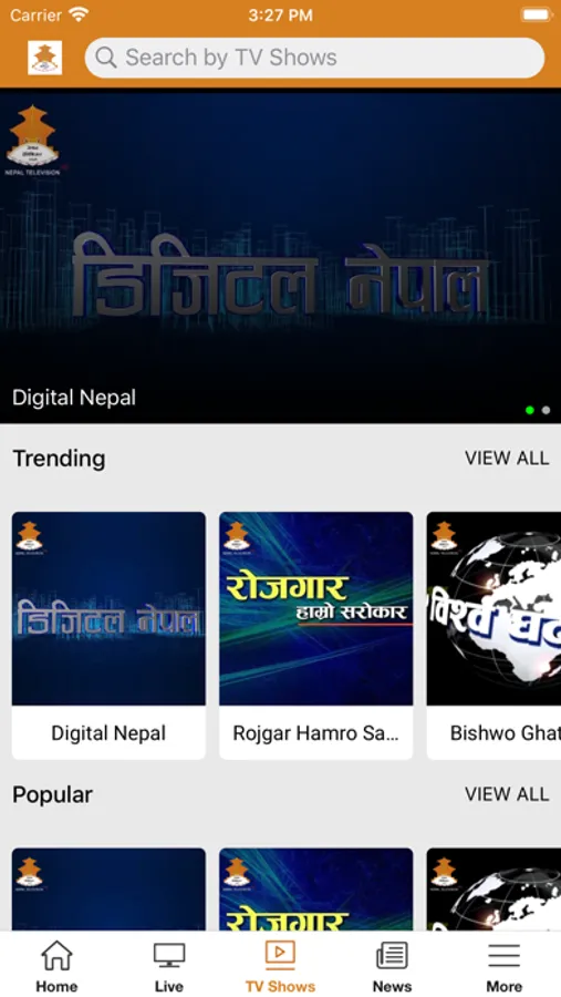 Nepal Television (Nepali: नेपाल टेलिभिजन abbreviated in English as NTV) is an autonomous public service broadcaster of the Republic of Nepal. One of Nepal's largest broadcasting organizations in studio and transmitter infrastructure, it was established on December 31, 1983. NTV, which also broadcasts on digital terrestrial transmitters, provides 4 television channels, online and mobile app service. It has recently Introduced OTT Mobile App to expand its reach to everyone's hand.