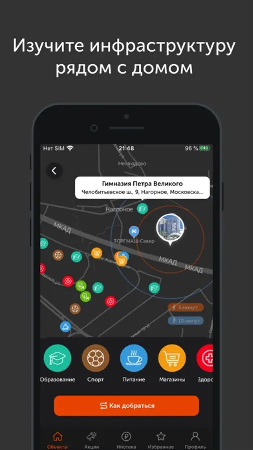 - Найти объект на карте и узнать больше об инфраструктуре рядом: транспорт, учебные заведения, магазины, парки, кафе, торговые центры;