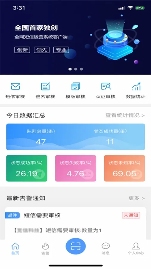 全国首家独创平台APP,以短信平台为中心,将审核、统计、告警整合在一起,打破PC端的限制实现移动办公的便利性,实现了创新、领先、唯一、高效、优质、便捷、及时、安全的理念,带给用户前所未有的用户体验。