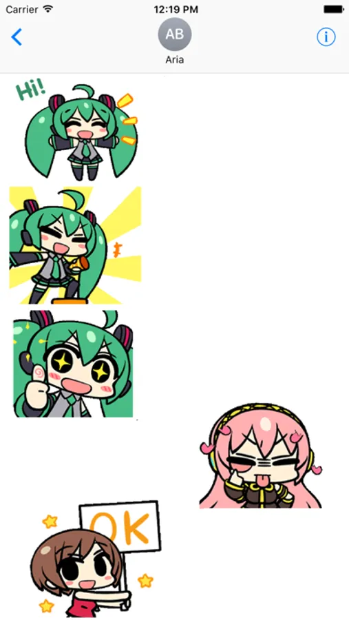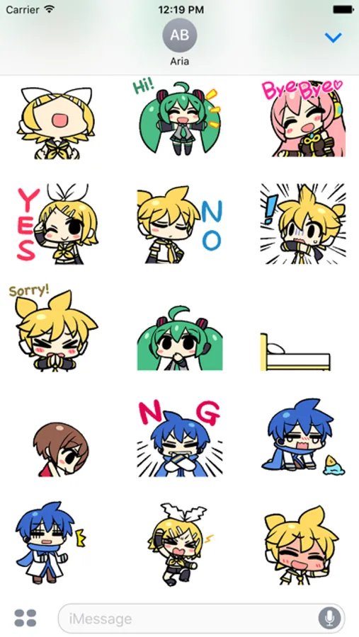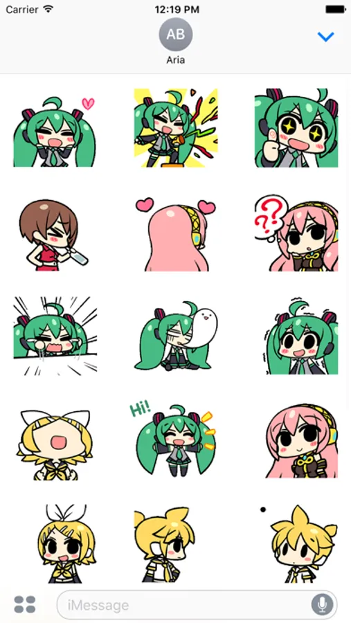 Miku, Rin, Len, Luka, Meiko and Kaito in these animated Vocaloid stickers. Do you want to impress your friends? Now you can enhance your iMessages with these stickers. Make your conversations cuter with them!