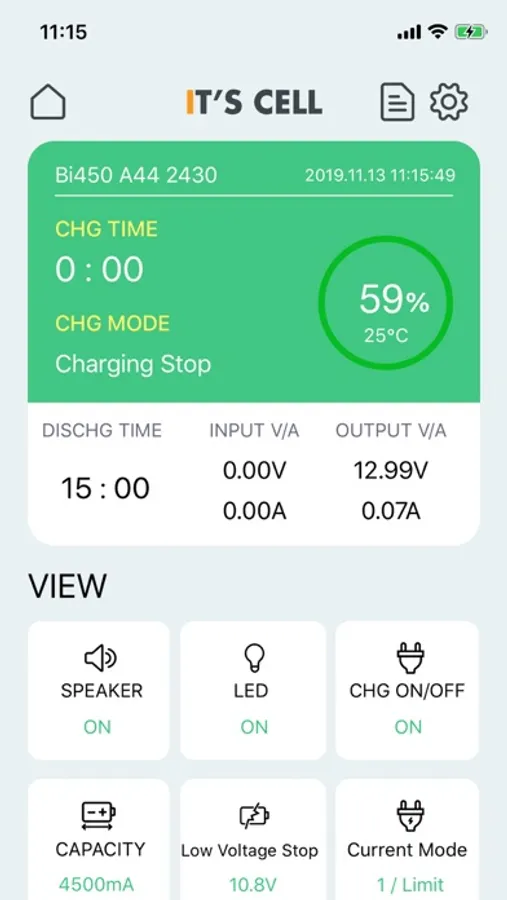 ITSCELL operation status, battery capacity and remaining capacity, temperature, charge and usable time display, error display and some operation setting functions.