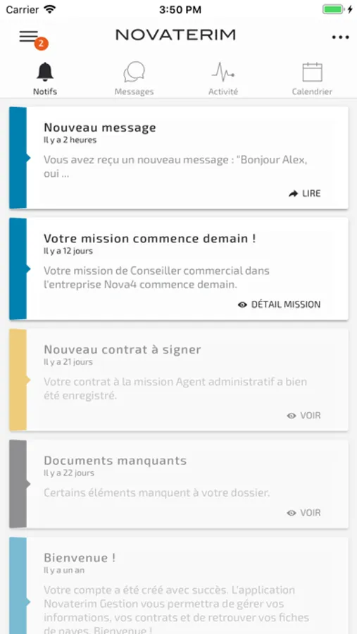 L'application Novaterim Gestion vous permet d'accéder à vos éléments personnels de collaboration avec l'agence de gestion administrative de contrats de travail temporaire Novaterim.