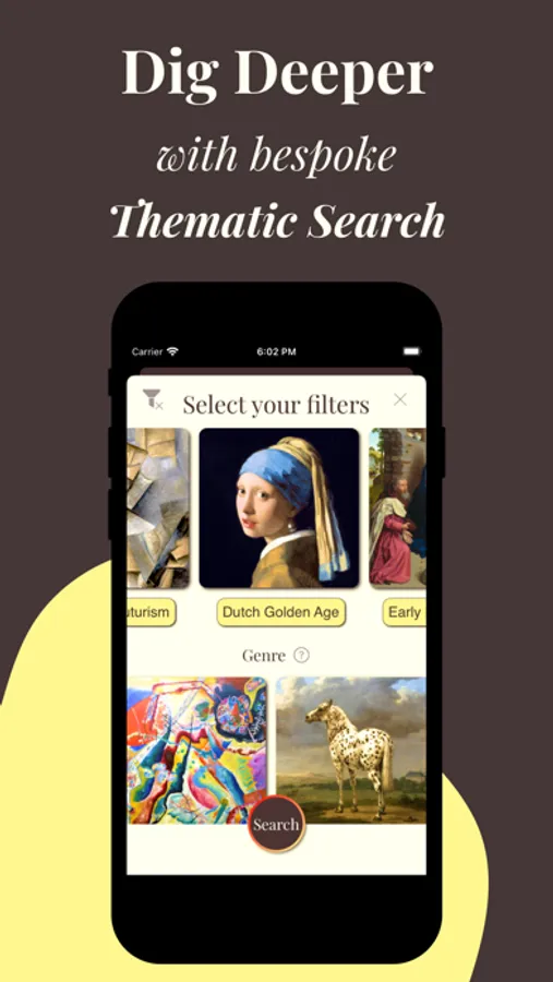 • Thematic Search - Browse artworks by filtering them by style, genre, artist, school, and other tags.
