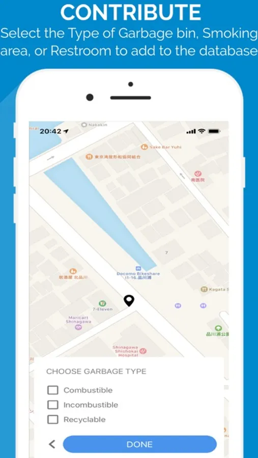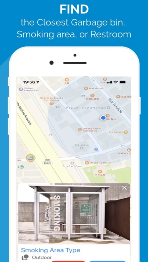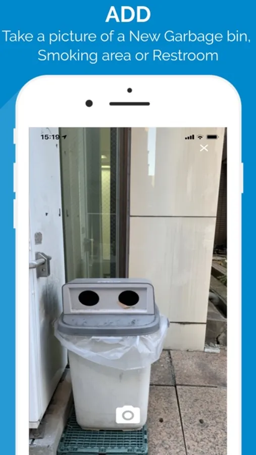 Help other tourists by adding a new garbage bin, smoking area, or restroom into the app's database.